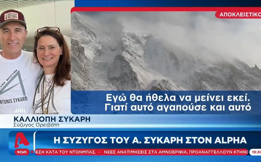 «Εγώ θα ήθελα να μείνει εκεί, γιατί αυτό αγαπούσε και αυτό θα ήθελε και εκείνος» λέει φανερά συγκινημένη για τον σύζυγό της Αντώνη Συκάρη, τον κορυφαίο ορειβάτη που άφησε την τελευταία του πνοή στα Ιμαλάι κατά την κατάβαση από την κορυφή η γυναίκα του Καλλιόπη.