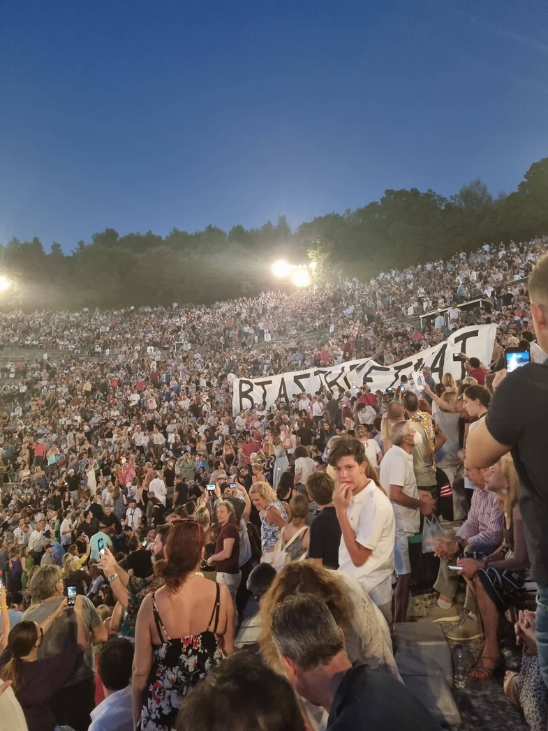 Οι θεατές της παράστασης “Πέρσες” του Αισχύλου σε σκηνοθεσία Δημήτρη Καραντζά που παίζεται απόψε στο θέατρο της Επιδαύρου σήκωσαν πανό διαμαρτυρίας για την αποφυλάκιση του καταδικασθέντα για δύο βιασμούς ανηλίκων, Δημήτρη Λιγνάδη, στο οποίο έγραφαν: “ΕΙΝΑΙ ΒΙΑΣΤΗΣ”.