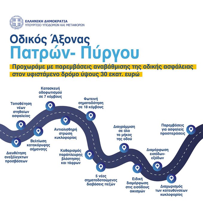 Προχωράμε και με στοχευμένες παρεμβάσεις οδικής ασφάλειας στον υπάρχοντα δρόμο ύψους 30 εκατ. ευρώ. Η ενίσχυση της ασφάλειας του υφιστάμενου οδικού δικτύου είναι αναγκαία αλλά και δίκαιη τόσο για τους πολίτες της Ηλείας και της Αχαΐας, όσο και για τους επισκέπτες της περιοχής.