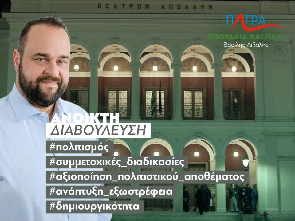 Με τον τομέα του Πολιτισμού συνεχίζεται η δημόσια διαβούλευση με τους πολίτες της Πάτρας που πραγματοποιεί η παράταξη «Πάτρα, Σπουδαία και Πάλι» με επικεφαλής τον υποψήφιο δήμαρχο Πατρέων Βασίλη Αϊβαλή.