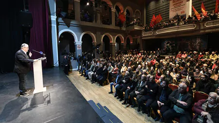 Η αίθουσα του Royal ήταν κατάμεστη από εργατικό, λαϊκό κόσμο και νεολαία που έδωσαν δυναμικό «παρών» στην σημερινή εκδήλωση.