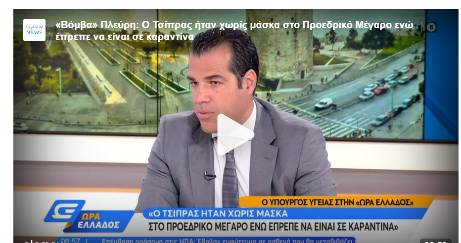Πόλεμος ξέσπασε μεταξύ Υπουργού Υγείας και ΣΥΡΙΖΑ για τον κορονοϊό του Αλέξη Τσίπρα. Ο Πλεύρης είπε ότι ο αρχηγός της αξιωματικής αντιπολίτευσης, ο οποίος είχε ανακοινώσει πως ήταν θετικός για δεύτερη φορά στον κορωνοϊό, θα έπρεπε να βρίσκεται σε καραντίνα και παρόλα αυτά εμφανίστηκε την Κυριακή στη δεξίωση για την Αποκατάσταση της Δημοκρατίας στο Προεδρικό Μέγαρο και μάλιστα χωρίς μάσκα.