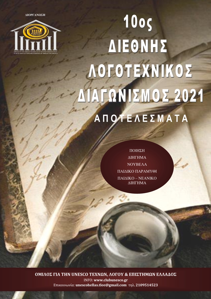 Ο Όμιλος για την UNESCO Τεχνών, Λόγου και Επιστημών Ελλάδος ανακοινώνει τα αποτελέσματα του 10ου Διεθνούς Λογοτεχνικού Διαγωνισμού, έτους 2021, ο οποίος έληξε στις 20 Ιουλίου. Ο διαγωνισμός  διοργανώνεται σε ετήσια βάση από τον Όμιλο και έχει καθιερωθεί πλέον ως ένας από τους θεσμούς του, με στόχο να αποτελέσει «βήμα» για την ανάδειξη νέων ταλέντων στη Νέα Ελληνική Λογοτεχνία. Αφορά δε τα είδη του λόγου: Ποίηση, ΔιήγημαΝουβέλαΠαιδικό παραμύθι και Παιδικό – νεανικό διήγημα.