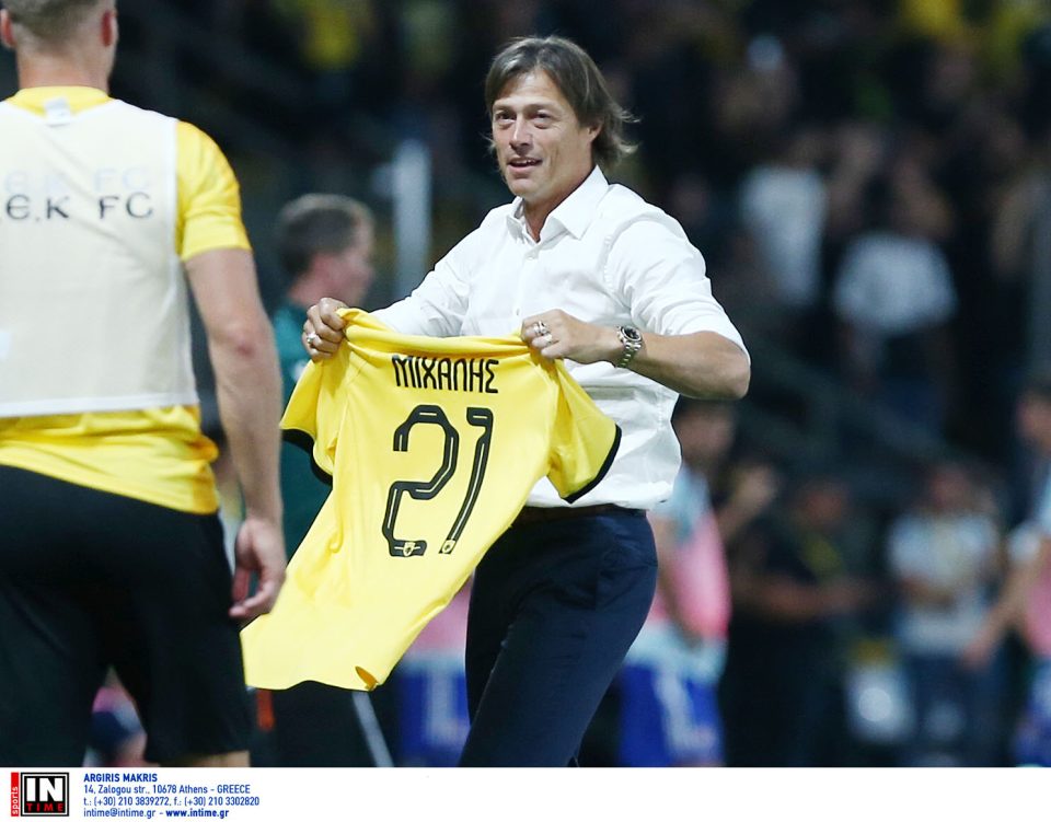 Ο Ματίας Αλμέιδα μετά τη λήξη του αγώνα-θρίλερ, σήκωσε μια φανέλα της ΑΕΚ με το όνομα του Μιχάλη προς τον κόσμο της ομάδας, την ώρα που τον έχει πάρει στα χέρια ένας οπαδός.