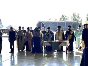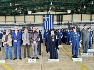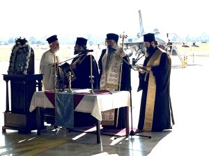 Ὁ Σεβασμιώτατος εὐχήθηκε στόν Διοικητή τῆς Πτέρυγος, στούς Ἀξιωματικούς, Ὑπαξιωματικούς καί Σμηνίτας καί σέ ὃλη τήν Πολεμική Ἀεροπορία, νά ἒχουν δύναμιν ἐξ’ ὓψους, ὑγιεία καί σκέπη οὐρανία, ταῖς προστασίαις τῶν Παμμεγίστων Ταξιαρχῶν, Μιχαήλ καί Γαβριήλ καί πασῶν τῶν Ἐπουρανίων Δυνάμεων Ἀσωμάτων, ὣστε νά ὑπερασπίζουν τήν ἐδαφική ἀκεραιότητα καί τά δίκαια τῆς Πατρίδος μας, ἒναντι ὃσων τά ἐπιβουλεύονται καί κυρίως ἒναντι τῶν ἐξ Ἀνατολῶν προκλητικῶν γειτόνων μας, οἱ ὁποῖοι ἀνέκαθεν παρεῖχαν καί παρέχουν πράγματα στό Ἒθνος μας.