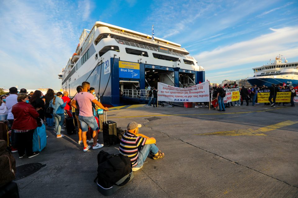 Αγανακτισμένοι επιβάτες έξω από το επιβατηγό οχηματαγωγό πλοίο «blue star delos» στο Λιμάνι του Πειραιά που ήταν προγραμματισμένο να αναχωρήσει στις 07:25 το πρωί για Θήρα – Πάρο – Νάξο.