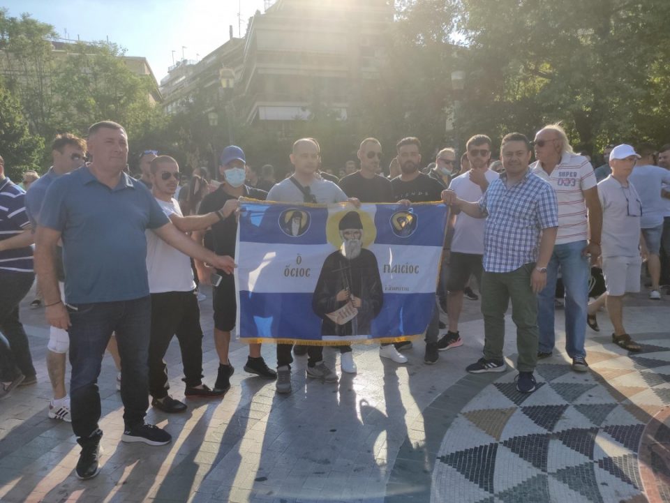 Μεταξύ των συγκεντρωμένων και πολλά άτομα που τάσσονται κατά του εμβολιασμού για τον κορωνοϊό γενικώς και όχι μόνο κατά της υποχρεωτικότητας.