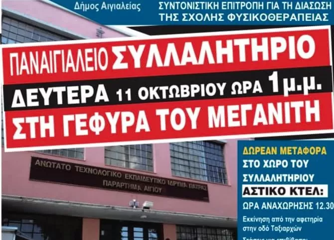Εφτασε η ώρα για το συλλαλητήριο στο Αίγιο. Από τη Συντονιστική Επιτροπή του δήμου και των φορέων της Αιγιάλειας ανακοινώνεται η διεξαγωγή Παναιγιάλειου Συλλαλητηρίου σήμερα Δευτέρα 11 Οκτωβρίου και ώρα 1.00μ.μ. στη Γέφυρα του Μεγανίτη (επί της Παλαιάς Εθνικής Οδού) κατά των ενεργειών για τη μεταφορά της σχολής Φυσικοθεραπείας Αιγίου στην Πάτρα.