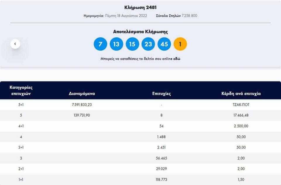 Οι τυχεροί αριθμοί που έβγαλε η κληρωτίδα είναι οι: 7, 13, 15, 23, 45 και Τζόκερ ο αριθμός 1.