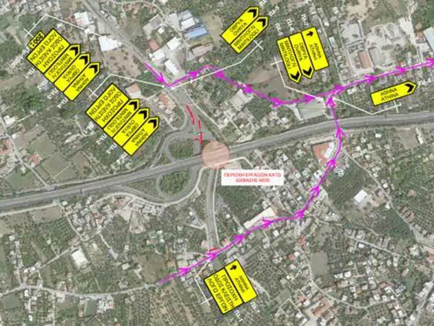 Στο διάστημα αυτό, οι τοπικές κινήσεις στην περιοχή του κόμβου της Οβρυάς θα εξυπηρετούνται από τις γειτονικές Κάτω Διαβάσεις, όπως φαίνεται στο ακόλουθο σχηματικό διάγραμμα.