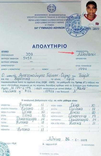Δείτε το απολυτήριο του Γιάννη Αντετοκούνμπο στη Γ’ Γυμνασίου! Από βαθμούς πολύ μέτρια πράγματα… Αλλά ποτέ δεν είχε σημασία αυτό. Γιατί ως αθλητής ήταν τούρμπο από τότε! Στη Γυμναστική είχε 20. Αριστα.