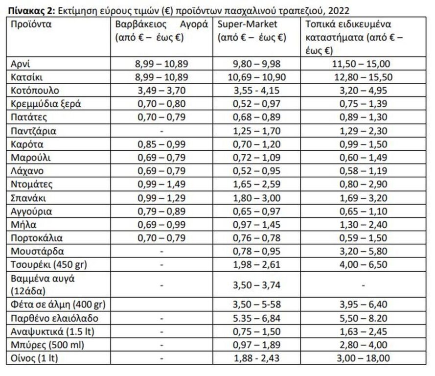 Σύμφωνα με το Ινστιτούτο Εμπορίου και Υπηρεσιών της Ελληνικής Συνομοσπονδίας Εμπορίου και Επιχειρηματικότητας (ΙΝ.ΕΜ.Υ.-ΕΣΕΕ), εμφανίζεται πολύ αυξημένο το κόστος στο φετινό πασχαλινό τραπέζι, επιβεβαιώνοντας τις εκτιμήσεις που έχουν αποτυπωθεί και σε άλλες σχετικές έρευνες, μετά από τιμοληψία που διενήργησε τόσο από μεγάλες αλυσίδες super-markets όσο και από ειδικευμένα καταστήματα τροφίμων, αλλά και από τη Βαρβάκειο αγορά.