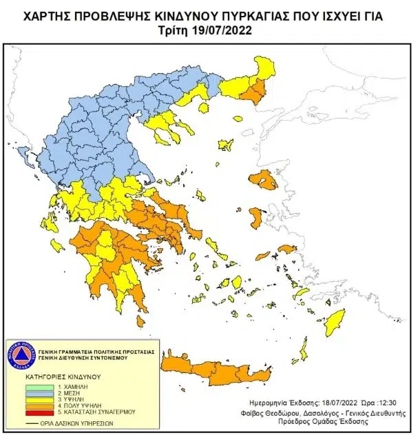 Σύμφωνα με το Χάρτη Πρόβλεψης Κινδύνου Πυρκαγιάς που εκδίδει η Γενική Γραμματεία Πολιτικής Προστασίας του Υπουργείου Κλιματικής Κρίσης & Πολιτικής Προστασίας (www.civilprotection.gr), για αύριο Τρίτη 19 Ιουλίου 2022, προβλέπεται πολύ υψηλός κίνδυνος πυρκαγιάς (κατηγορία κινδύνου 4) για τις εξής περιοχές: