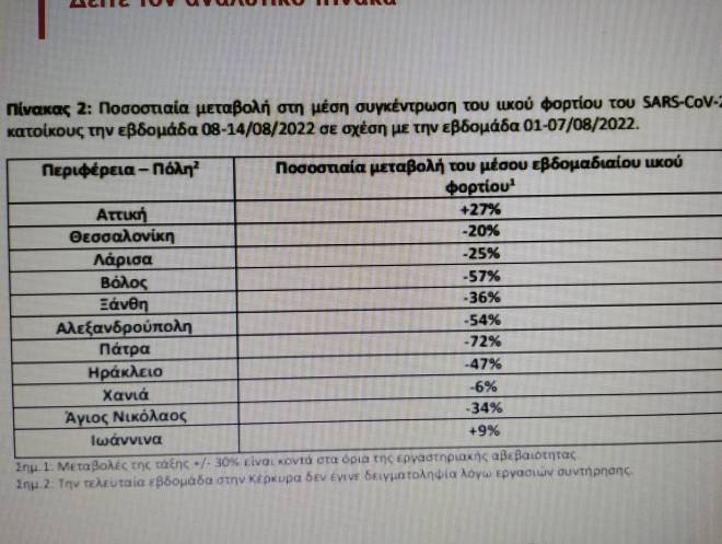 Την εβδομάδα 8 έως 14 Αυγούστου 2022, η είδηση είναι ότι το ιικό φορτίο στα λύματα της Πάτρας μειώθηκε κατά 72%. Σε καμία άλλη πόλη δεν υπήρχε τόσο θεαματική μείωση.