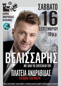 Ο Βελισσάρης ξενάρχεται. Ο κορυφαίος Ελληνας λαϊκός-δημοτικός καλλιτέχνης θα τραγουδήσει το Σάββατο 16 Σεπτεμβρίου στην κεντρική πλατεία της Ανδραβίδας, με ελεύθερη είσοδο για το κοινό.