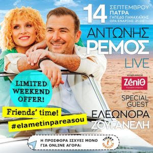 Είναι οριστικό πλέον. Στις 14 Σεπτεμβρίου έρχεται στην Πάτρα ο μεγάλος σταρ του λαϊκού πενταγράμμου. Ο Αντώνης Ρέμος. Σε συναυλία στο γήπεδο της Παναχαϊκής, όπου θα γίνει Ο πανικός!