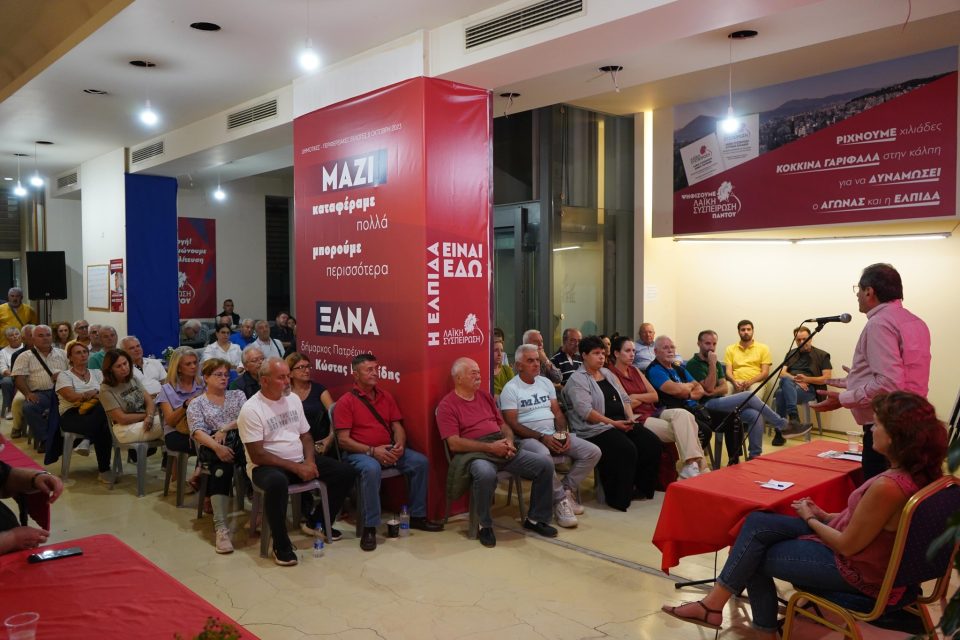 Το εκλογικό κέντρο γέμισε ασφυκτικά, ενώ στη σύσκεψη παρευρέθηκε και ο Σωτήρης Παρίσης, επικεφαλής του ψηφοδελτίου της Λαϊκής Συσπείρωσης στην Περιφέρεια Δυτικής Ελλάδας, το οποίο κατέγραψε σημαντικά ποσοστά στον Δήμο της Πάτρας, φτάνοντας στη δεύτερη θέση.