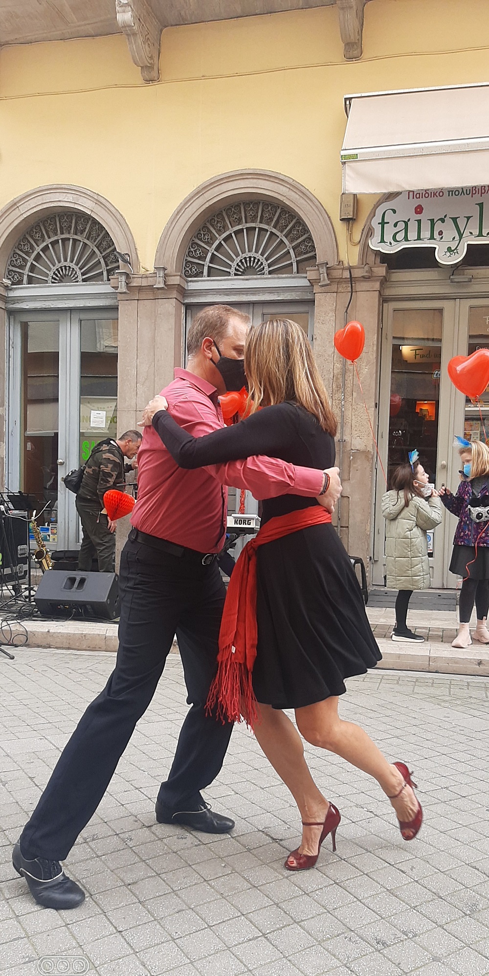 Στη συνέχεια η Πολυξένη Καραθανάση και ο Διονύσης Θεοδώρου, από τη Σχολή Χορού El Conventillo και με τη διδασκαλία του Γιώργου Λιναρδάτου, χόρεψαν Tango και καθήλωσαν τους περαστικούς που καταχειροκρότησαν την όλη εκδήλωση.