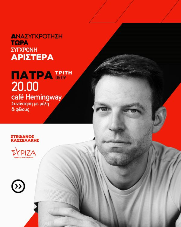Ο υποψήφιος Πρόεδρος του ΣΥΡΙΖΑ-Προοδευτική Συμμαχία Στέφανος Κασσελάκης, καλεί σήμερα Τρίτη 5-9 και ώρα 8.00μμ στο café bar Hemingway τα μέλη και τους φίλους του κόμματος, αλλά και κάθε νέο και νέα, κάθε προοδευτικό και δημοκράτη πολίτη της Πάτρας, σε μια συζήτηση για την ριζική ανασυγκρότηση του ΣΥΡΙΖΑ-Π.Σ. και της χώρας μας.
