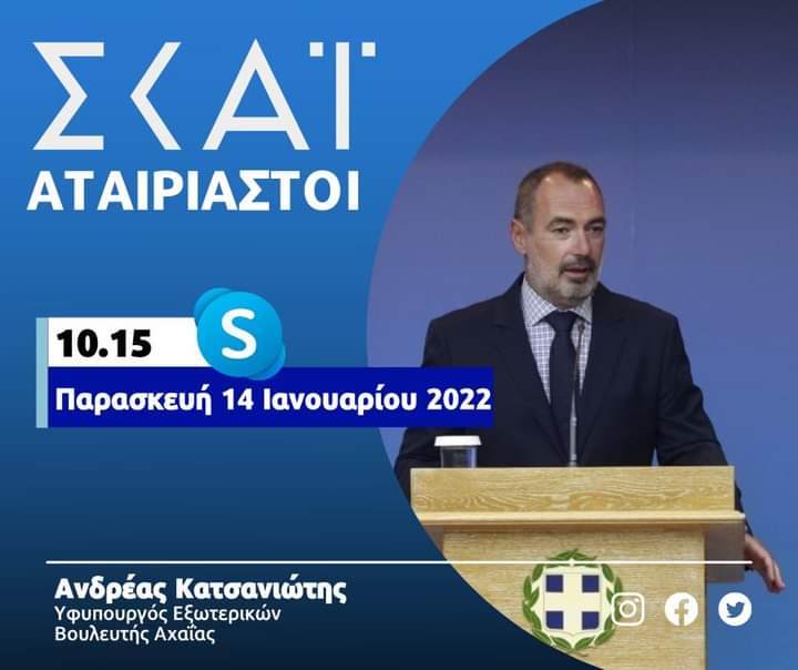 Αύριο Παρασκευή 14/1, στις 10.15π.μ., ο Αχαιός υφυπουργός Εξωτερικών Ανδρέας Κατσανιώτης θα βρίσκεται μέσω Skype στην εκπομπή Αταίριαστοι και τους δημοσιογράφους Γιάννη Ντσούνο και Χρήστο Κούτρα.