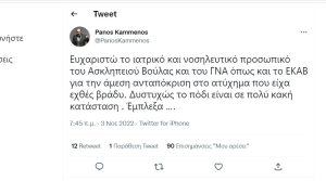 Με ανάρτησή του στο Twitter το πρωί της Πέμπτης, ο Πάνος Καμμένος ευχαρίστησε το ιατρικό και νοσηλευτικό προσωπικό του Ασκληπιειού Βούλας και του ΓΝΑ, καθώς και το ΕΚΑΒ για την άμεση ανταπόκριση στο ατύχημα που είχε.