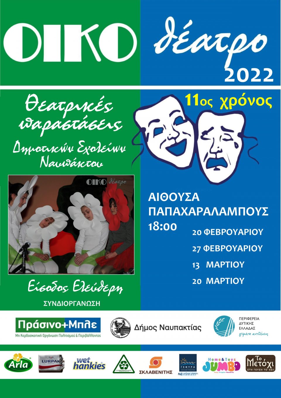 Συνεχίζεται για 11η  χρονιά, η προσπάθεια ευαισθητοποίησης των μαθητών της Α’ βάθμιας εκπαίδευσης σε θέματα οικολογίας, υλοποιώντας σειρά θεατρικών παραστάσεων, την ευθύνη και υλοποίηση των οποίων έχει η Μη Κερδοσκοπική Οργάνωση Πολιτισμού και Περιβάλλοντος «Πράσινο+Μπλέ» σε συνδιοργάνωση με τον Δήμο Ναυπακτίας και τη Περιφέρεια Δυτικής Ελλάδας.