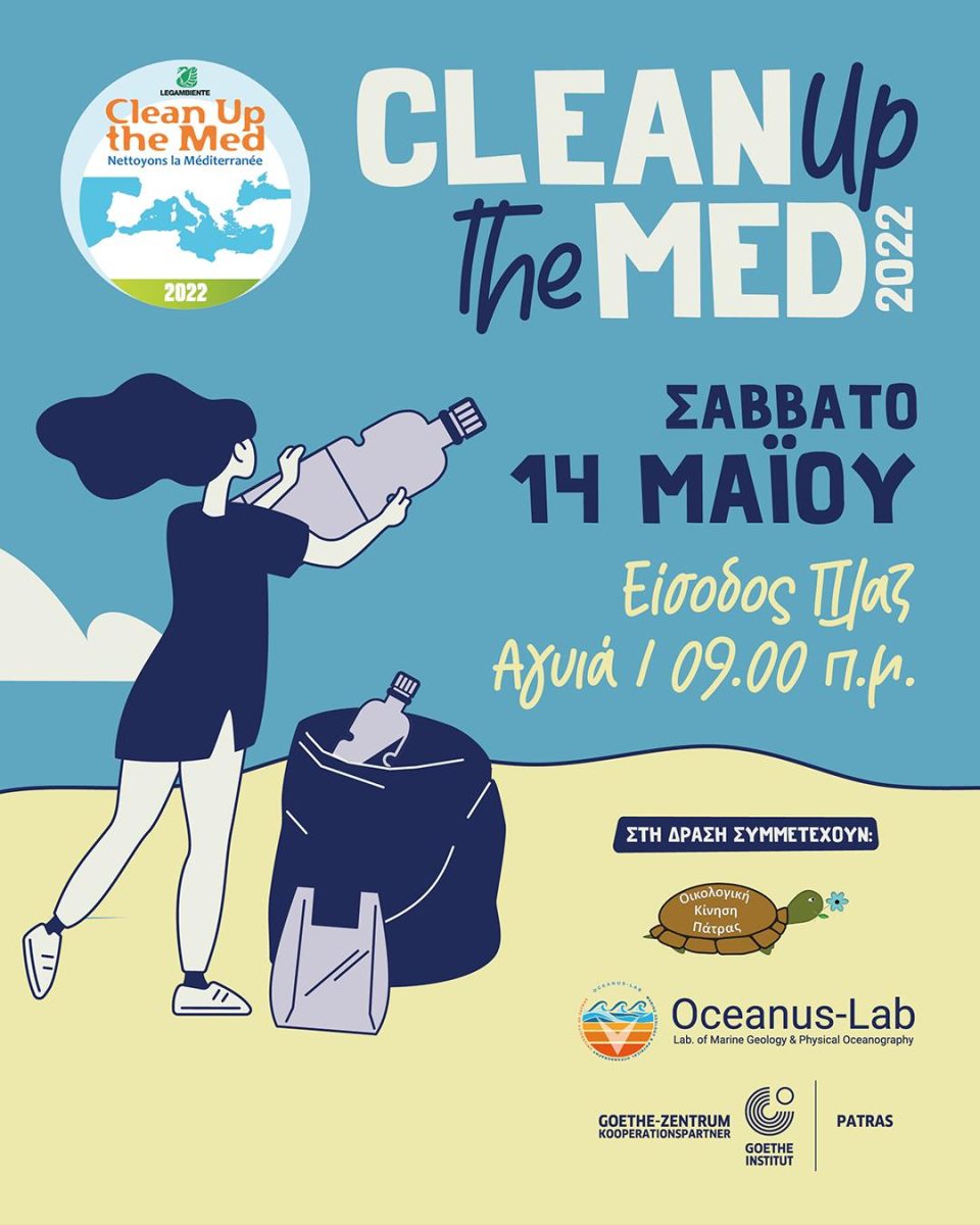 Η Οικολογική Κίνηση Πάτρας σε συνεργασία με το Ινστιτούτο Goethe–Zentrum Πάτρας και το Εργαστήριο Θαλάσσιας Γεωλογίας και Φυσικής Ωκεανογραφίας (Oceanus–Lab) του Τμήματος Γεωλογίας του Πανεπιστημίου Πατρών, συμμετέχουν στη δράση «Clean Up the Med 2022», διοργανώνοντας εθελοντικό καθαρισμό της ακτής και καταγραφή των απορριμμάτων στην περιοχή της Πλάζ, το Σάββατο 14 Μαΐου 2022 στις 9:00 πμ.